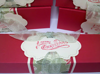 This is a view of the sides. I stamped the front with a CTMH heart stamp in CTMH tulip ink. The sides are stamped with Papertrey inks all over background hearts in CTMH baby pink. I cut my squares 3.25 inches and then punched all the way around the edges with a new Martha Stewart border and corner punch.